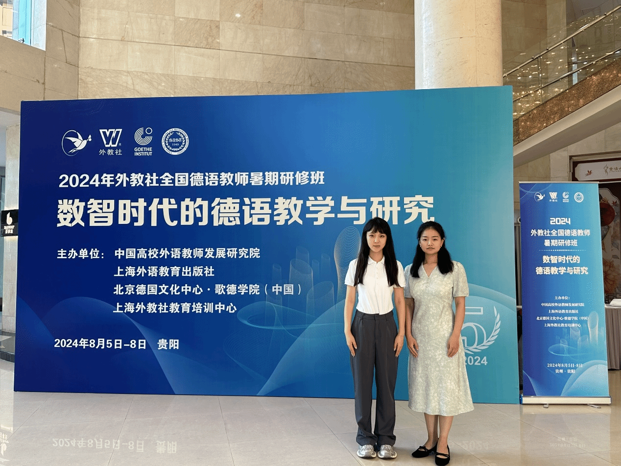 2024年8月5日至8月8日,2024年外教社全国德语教师暑期研修班在贵阳举办,此次研修班由中国高校外语教师发展研究院、上海外语教育出版社、北京德国文化中心·歌德学院(中国)及上海外教社教育培训中心共同主办的,以“数智时代的德语教学与研究”为主题,邀请中德两国的外语专家学者以及教育技术领域的专家,与全国高校及中学德语教师共同研讨德语课程建设与教学设计、德语教学资源的共建共享、人工智能在德语教学和科研中的应用等主题,赋能德全国德语教师发展。新葡萄8883官网AMG德语教研室的李玮、王萌莎两位老师作为教师代表参加了此次研修班并获得培训证书。