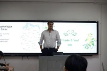 随后在第二环节,助教Julian Leon Neuhaus上台为大家带来了精彩的德国介绍。从德国的历史、地理、风土人情到美食、音乐、艺术,其用生动的语言和丰富的图片,让在场的每一位同学都仿佛置身于德国的大街小巷,感受到了德国的独特魅力。